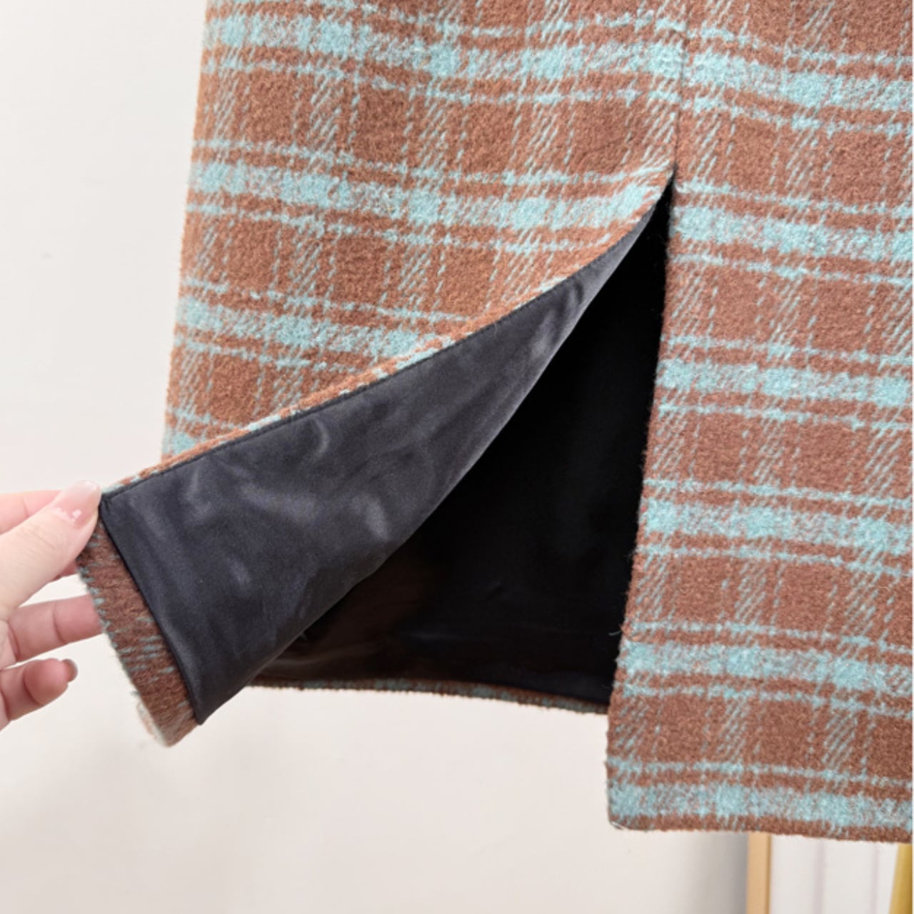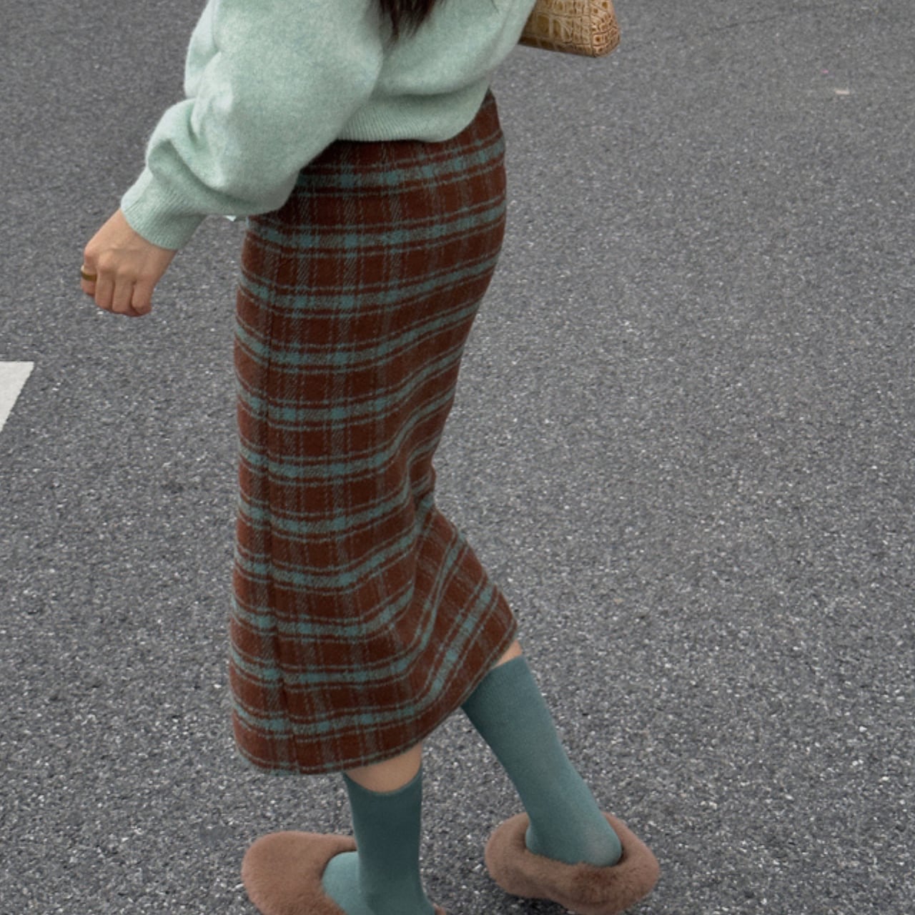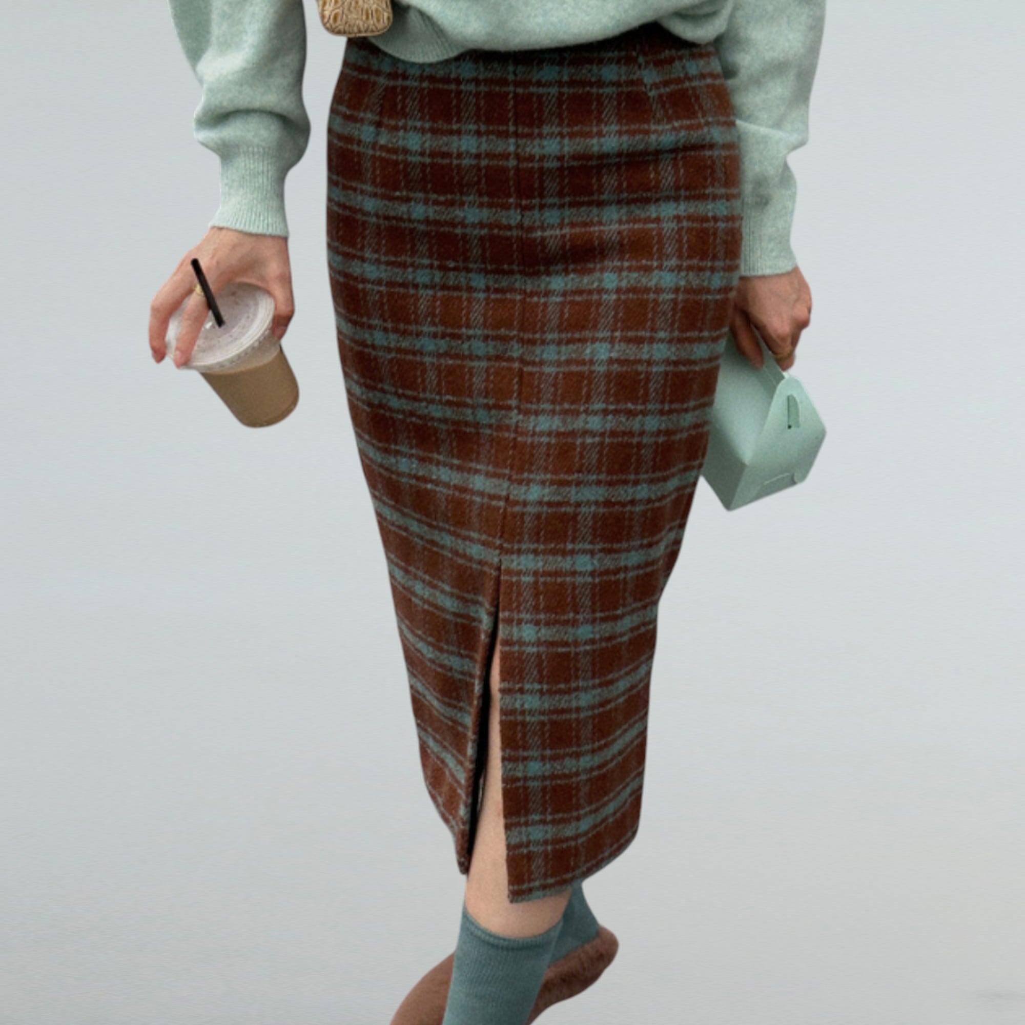 トレンドのチェック柄が目を引く、スリット入りミモレ丈タイトスカート。