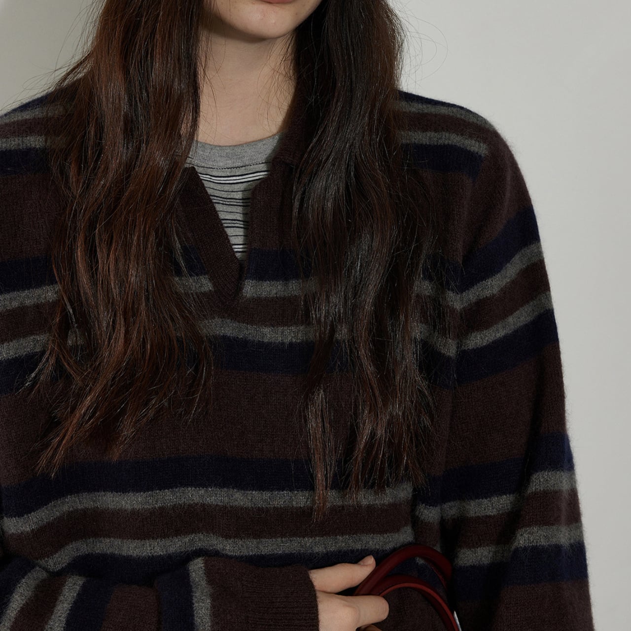 落ち着いた色合いのボーダー柄が、大人のカジュアルスタイルにマッチするニットポロシャツ。