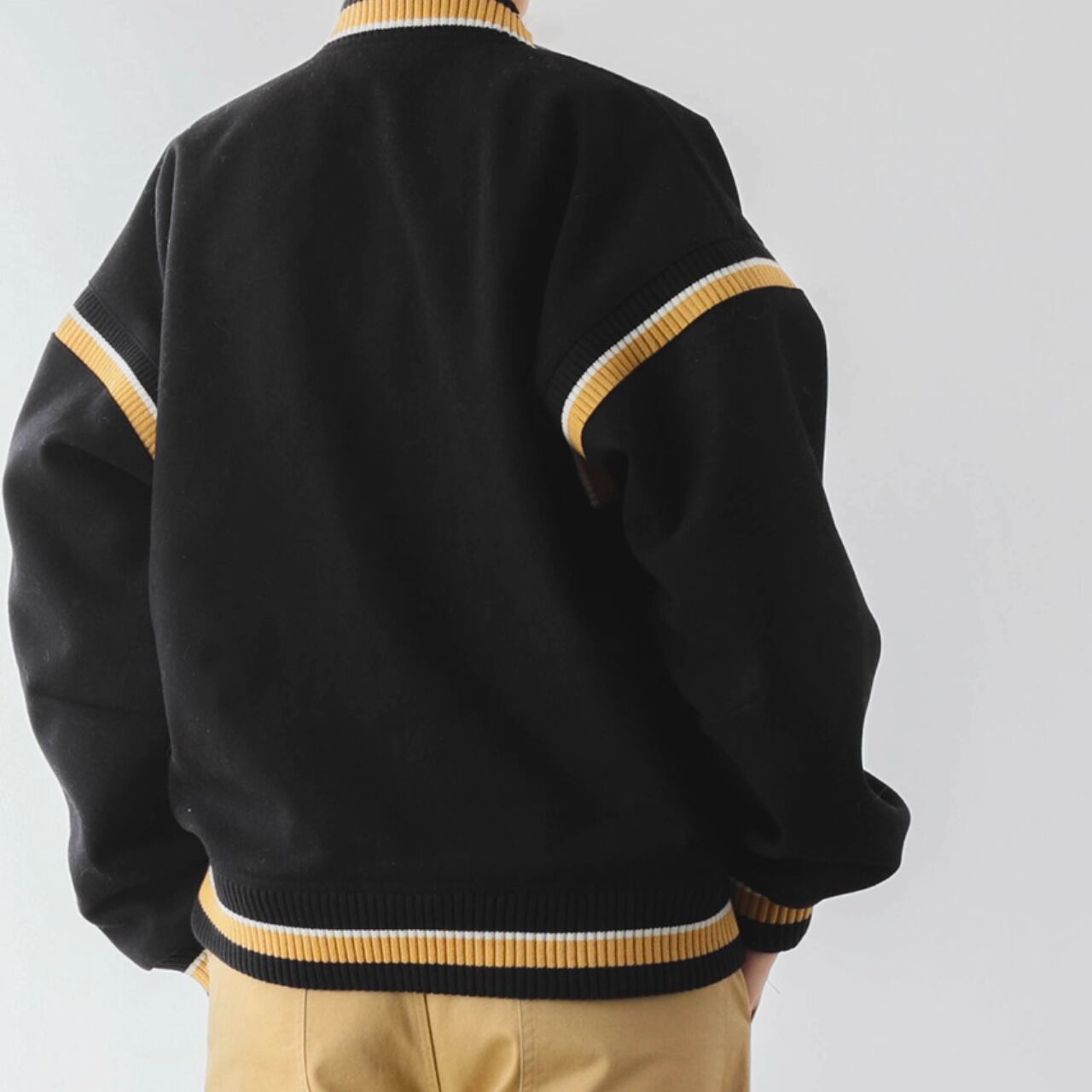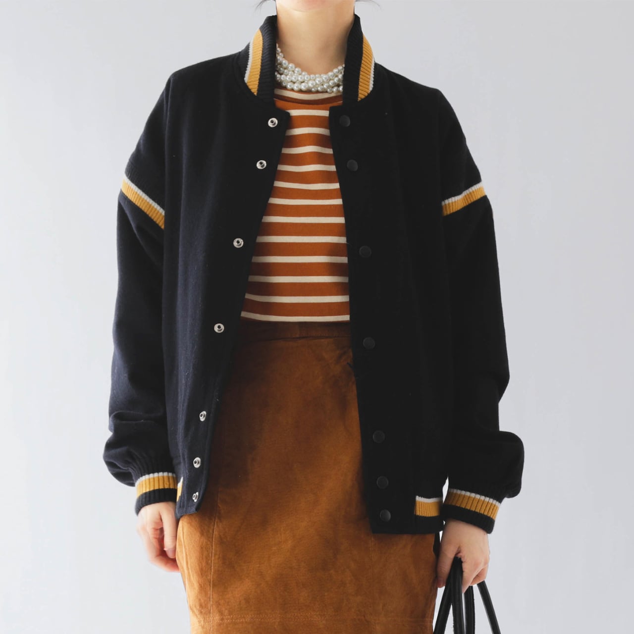 スタンドカラーとラグランスリーブが特徴的なスタジアムジャケット。