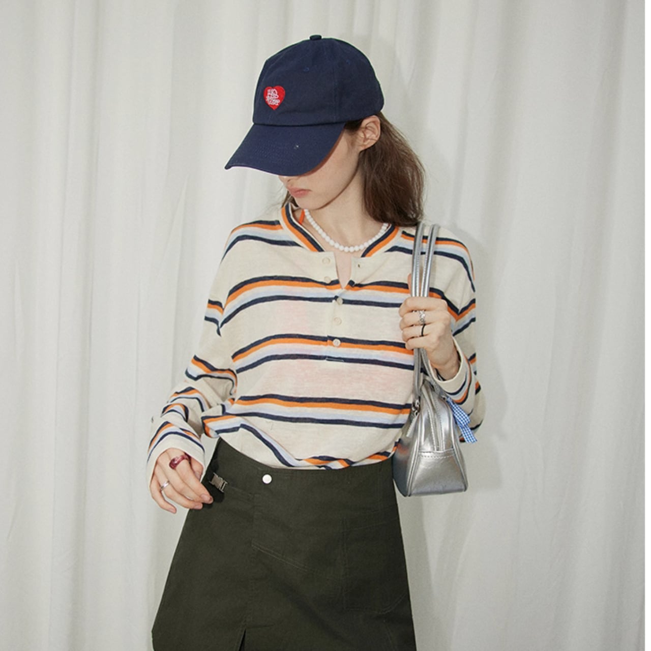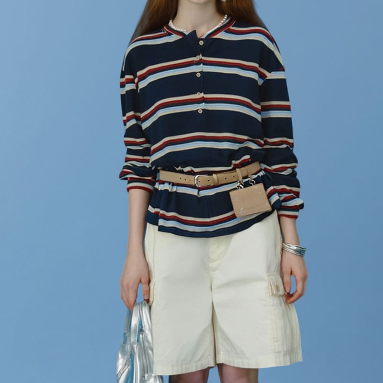 ボーダーのヘンリーネックトップスは、着回しやすさが魅力です。