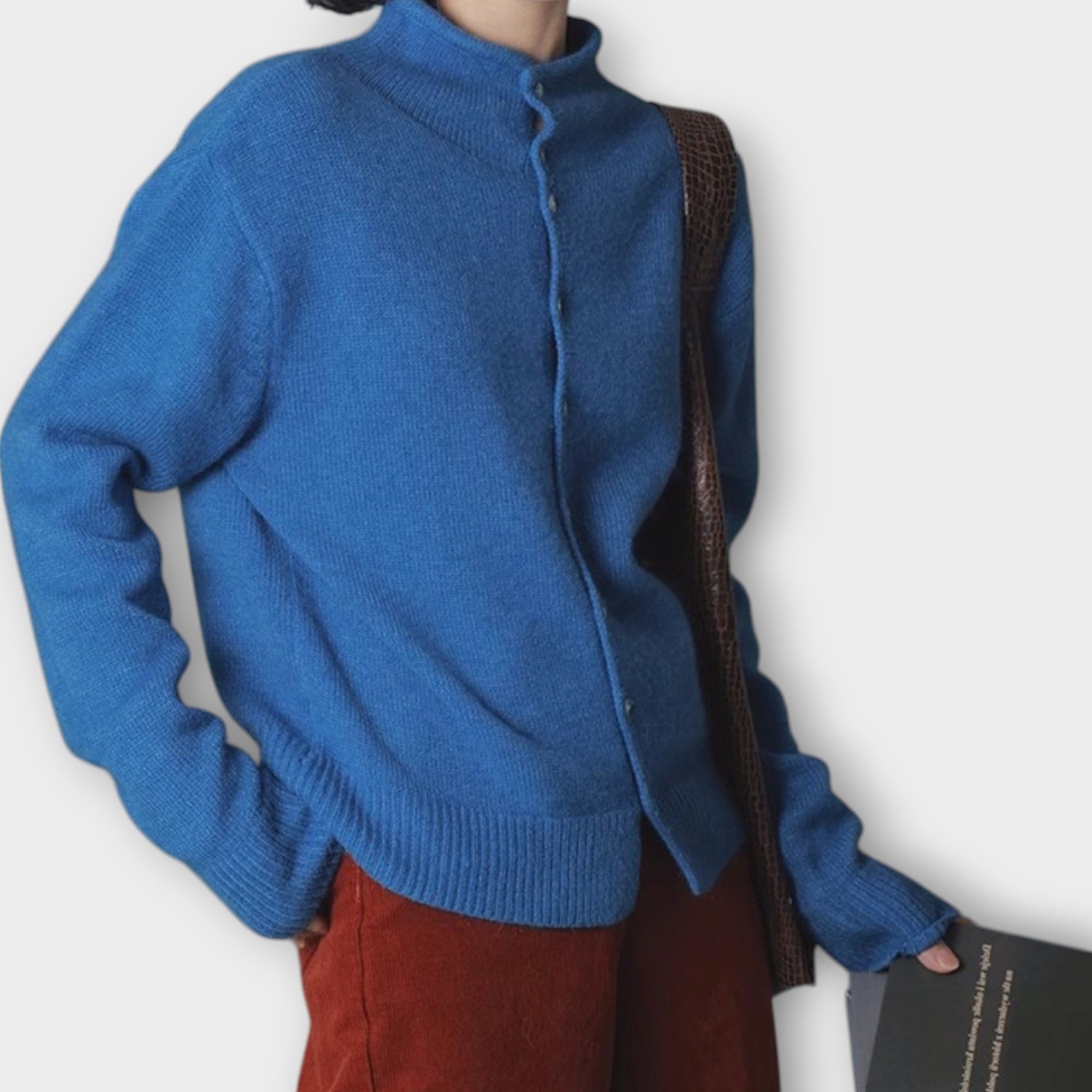 長袖のオープンカラーニットは、上品で落ち着いた印象を与えます。