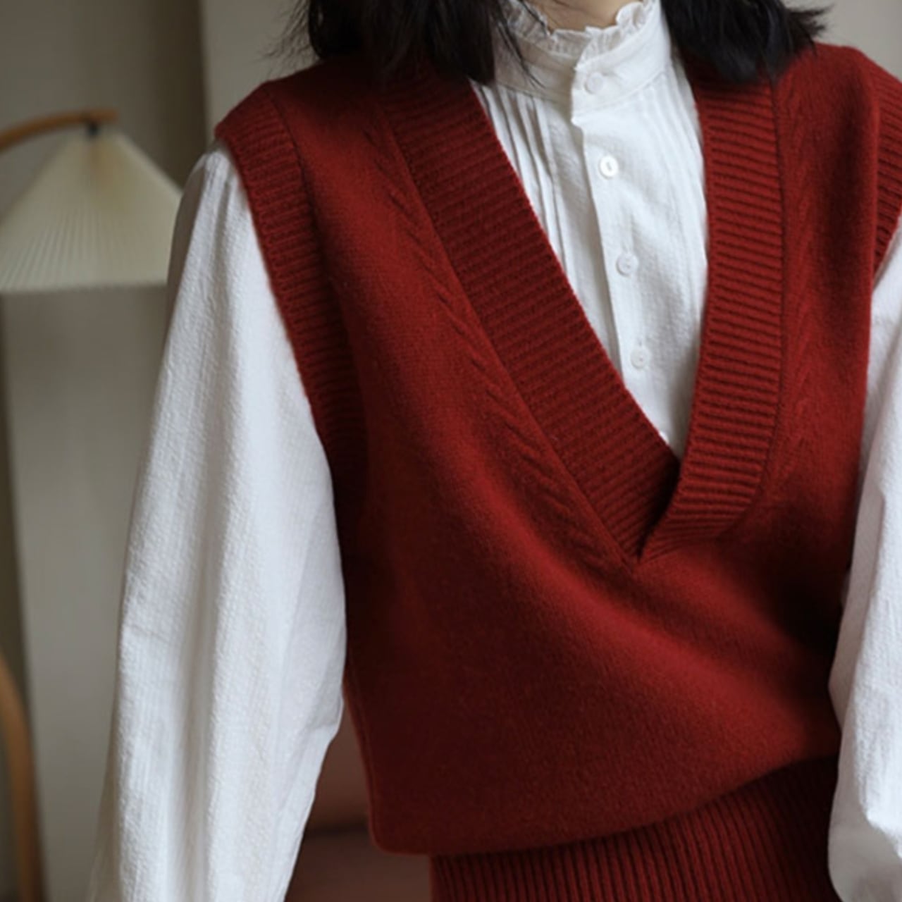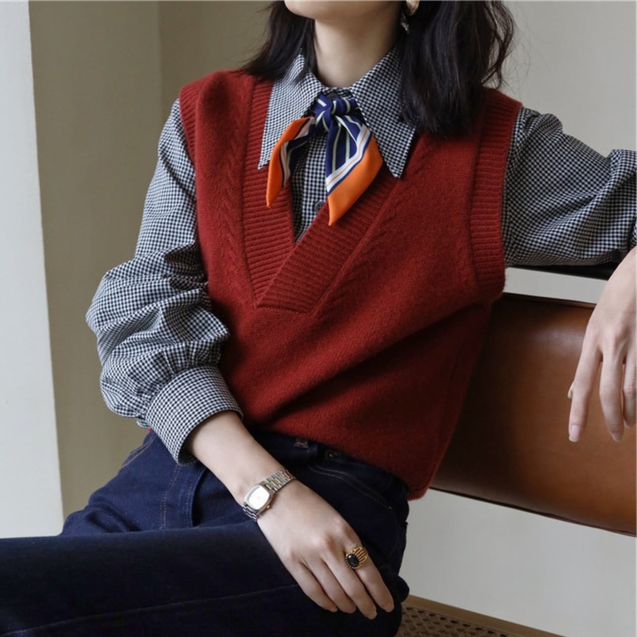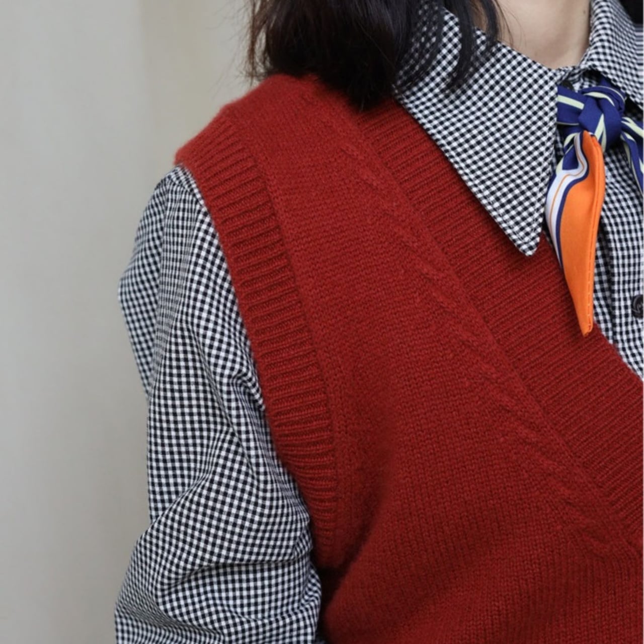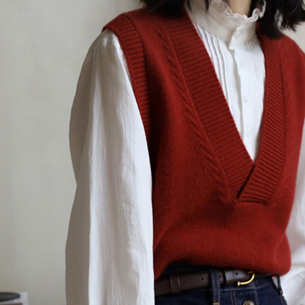 Vネックが顔周りをすっきりと見せてくれるノースリーブニットベスト。