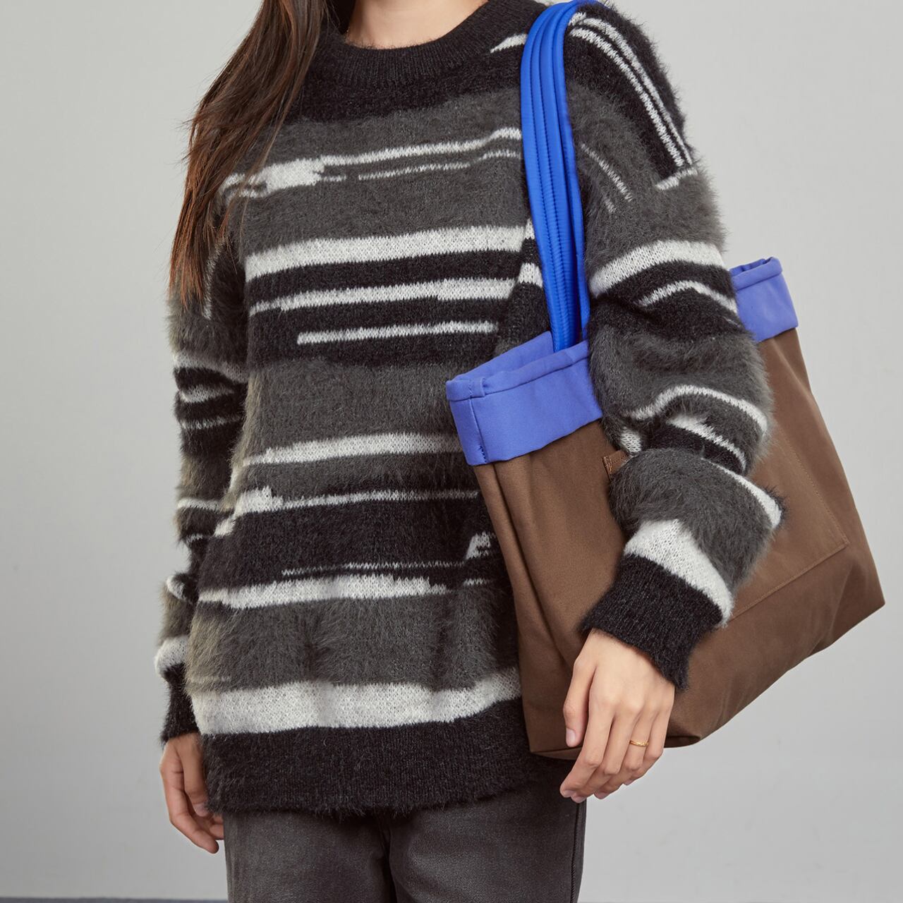 2色使いのデザインが、シンプルながらも洗練された印象を与え、コーディネートのアクセントになります。