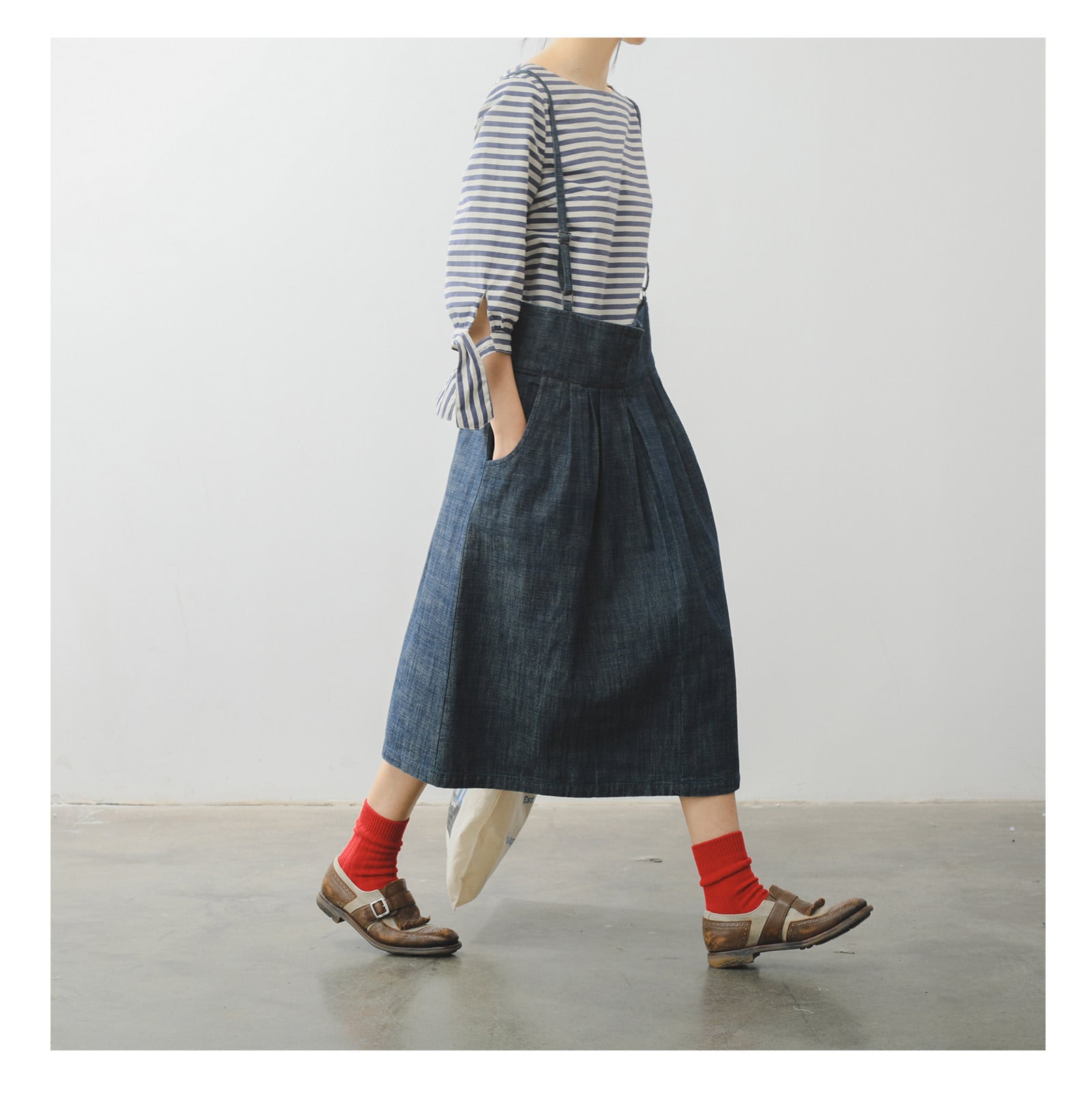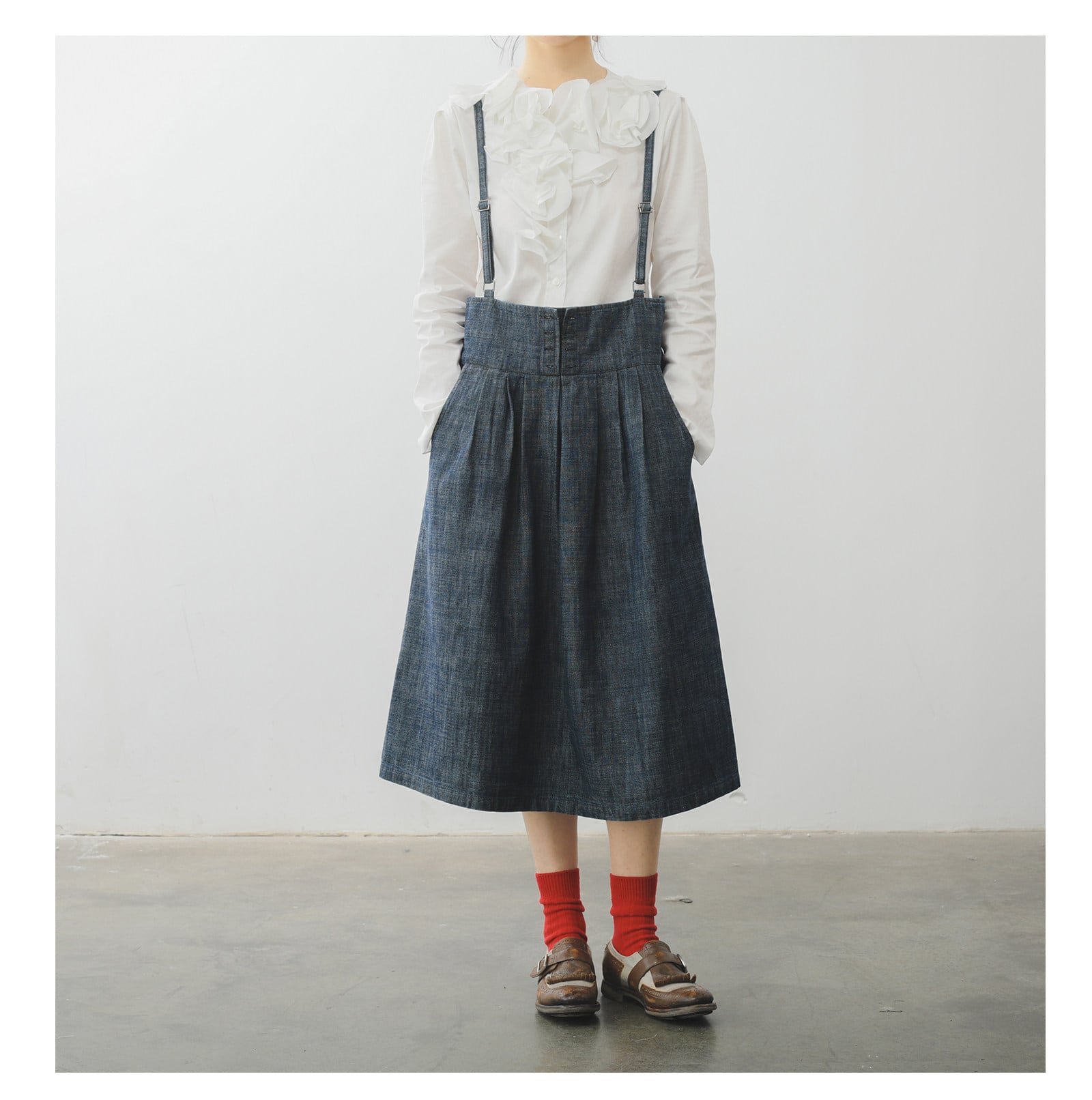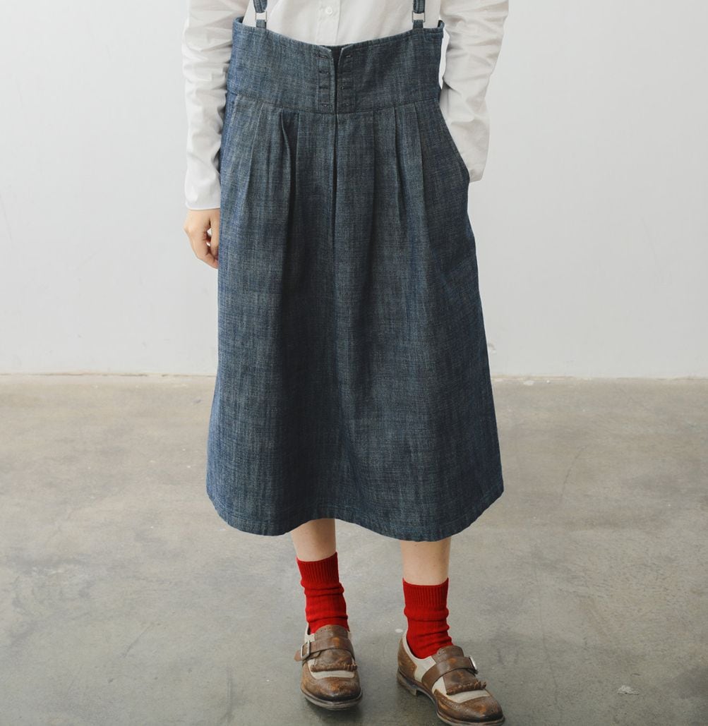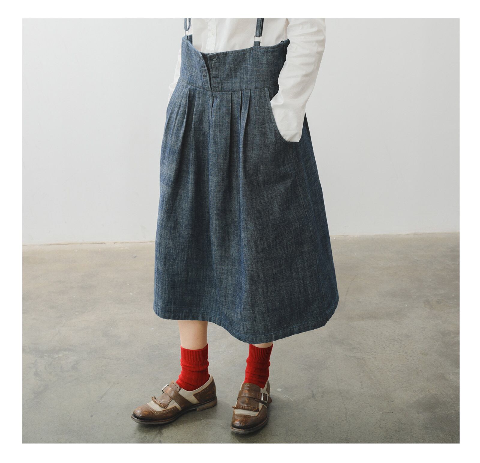 レトロ可愛い、サスペンダー付きミモレ丈スカート。