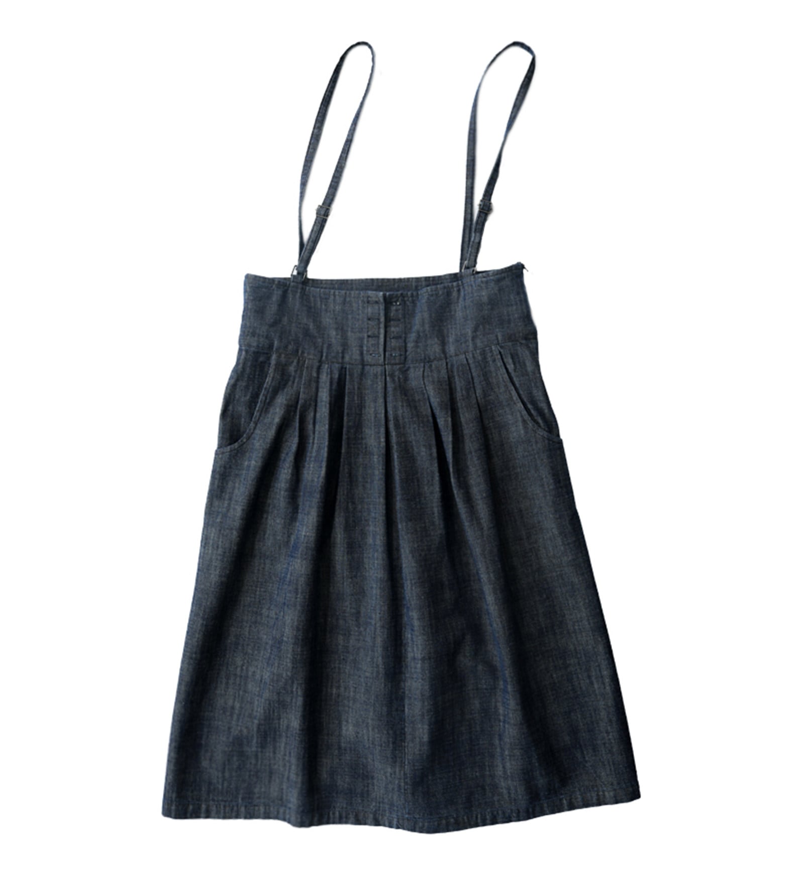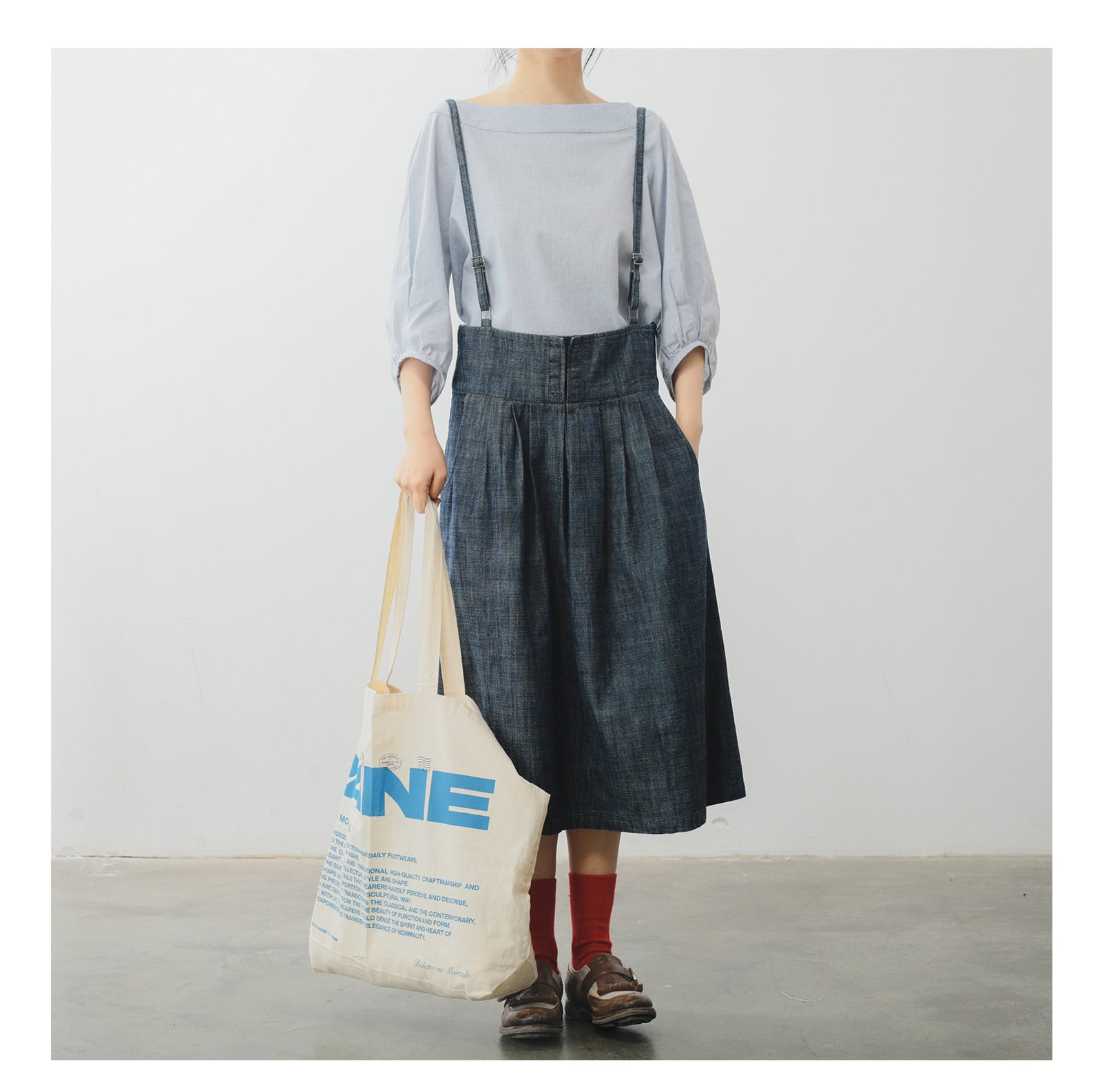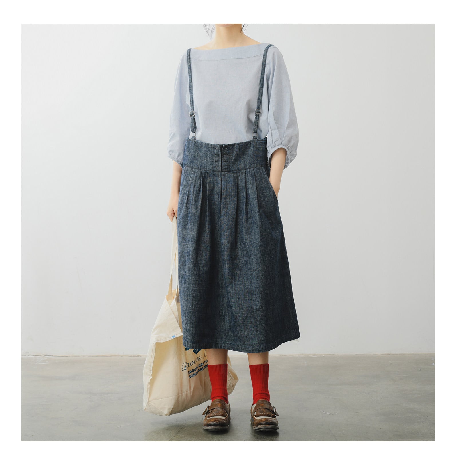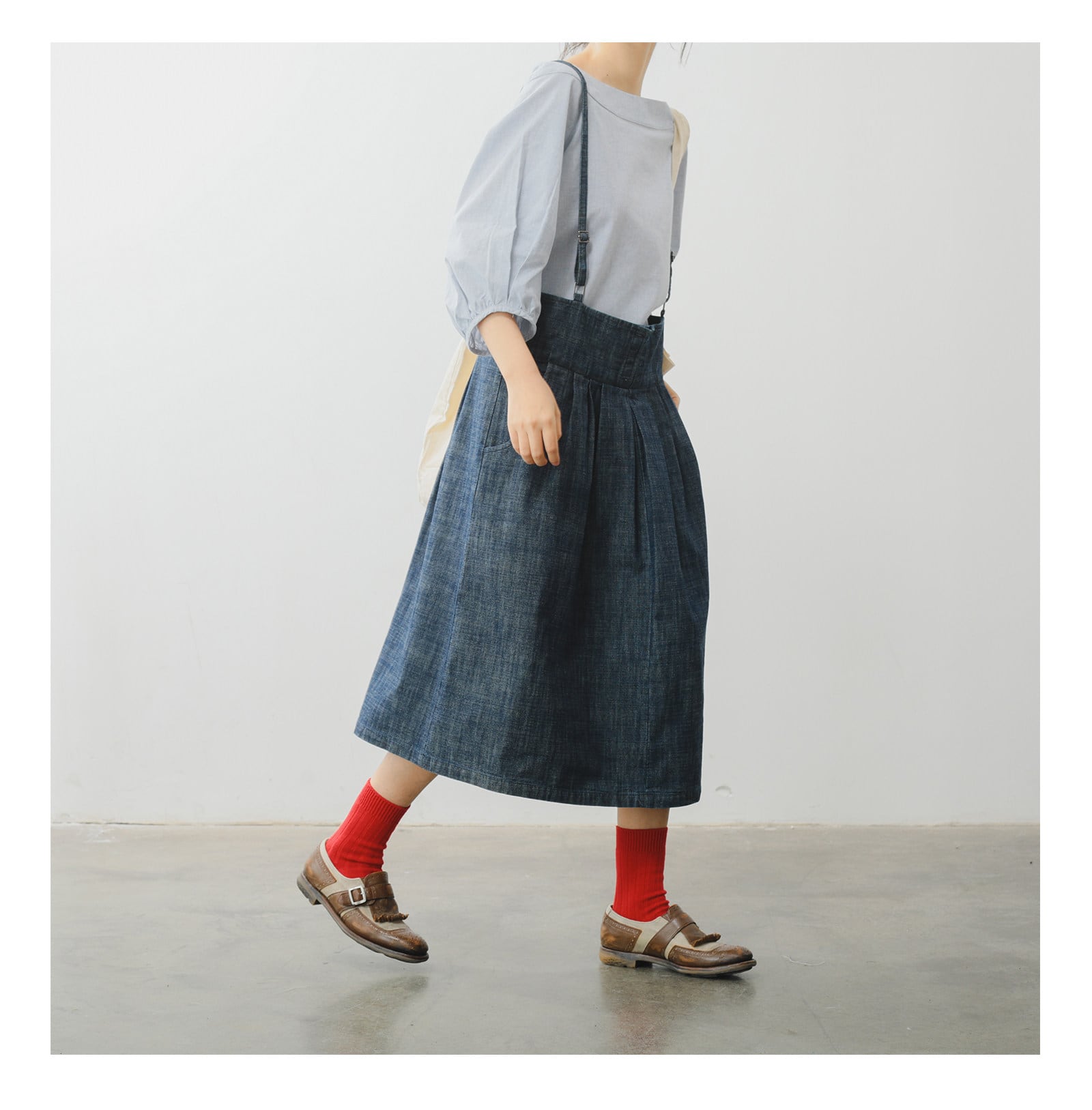 レトロ可愛い、サスペンダー付きミモレ丈スカート。