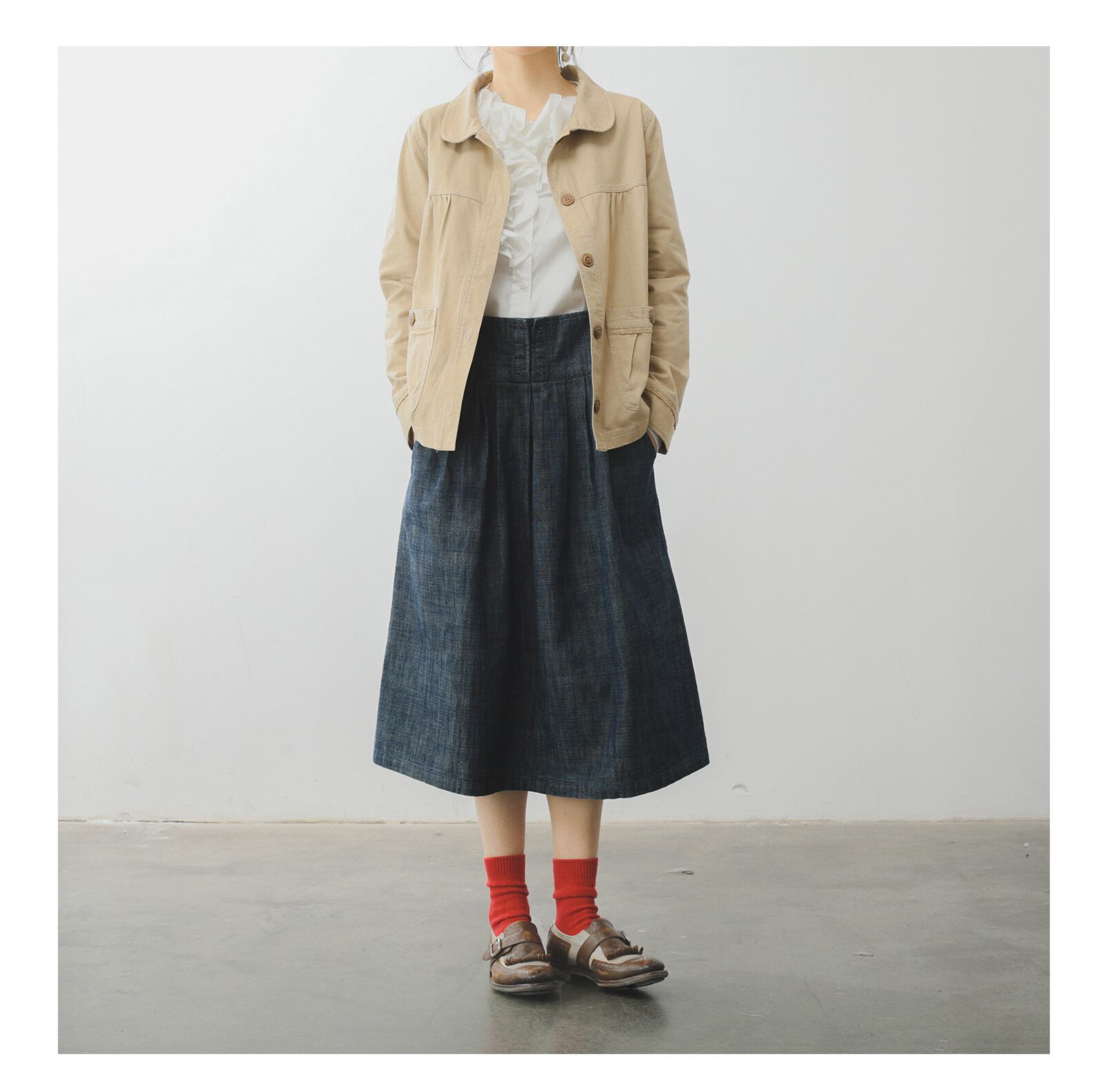 ブラウスやニットと合わせてガーリーに、Tシャツと合わせてカジュアルにと、幅広い着こなしが楽しめます。